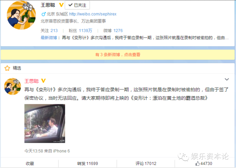 4月1日中午13:58分,国民老公王思聪在个人微博上发布:“再与《变形计》多次沟通后,我终于答应录制一期,这张照片就是在录制时被偷拍的,但由于签了保密协议,当时无法回应。请大家期待即将上映的《变形计:漂泊在黄土地的霸道总裁》”。短短2个小时内,该微博转发破万,评论直逼2万,点赞达4.4万……